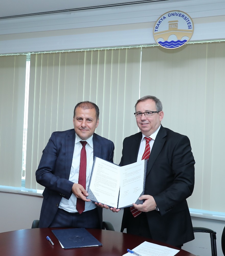 Kamu-Sanayi ve Üniversite iş birliğinde Edirne’yi lokomotif şehir haline getirmek için çalışmalarına devam eden Trakya Üniversitesi yeni bir protokole daha imza attı. Küçük ve orta büyüklükteki işletmelerin yanı sıra inovatif fikir sahibi gençlere de destek veren KOSGEB ile sanayiye teknolojik ve yetişmiş insan gücü alt yapısı ile büyük destek sağlayan Trakya Üniversitesi arasında 26 Temmuz 2019’da iş birliği protokolü imzalandı. Rektörlük Binası’nda gerçekleşen imza törenine Rektör Prof. Dr. Erhan Tabakoğlu ve Edirne KOSGEB İl Müdürü Veysel Vural’ın yanı sıra Dış İlişkiler Uygulama ve Araştırma Merkezi Müdürü Doç. Dr. Murat Türkyılmaz ile KOSGEM uzmanlarından Tarık Altuntaş katıldı.
