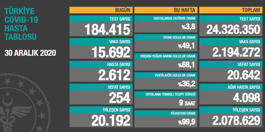 Bugün yapılan 184 bin 415 testten 15 bin 692 yeni vaka ve 2 bin 612 kişinin hastaneye kaldırıldığı belirtildi. Toplam vaka sayısının 2 milyon 194 bin 272, bugün 20 bin 192 kişinin iyileştiği, toplam iyileşen hasta sayısının 2 milyon 78 bin 629’a, toplam hasta içindeki pnömoni oranının yüzde 3,8 olduğu ve ağır hasta sayısı 4 bin 98 oldu.