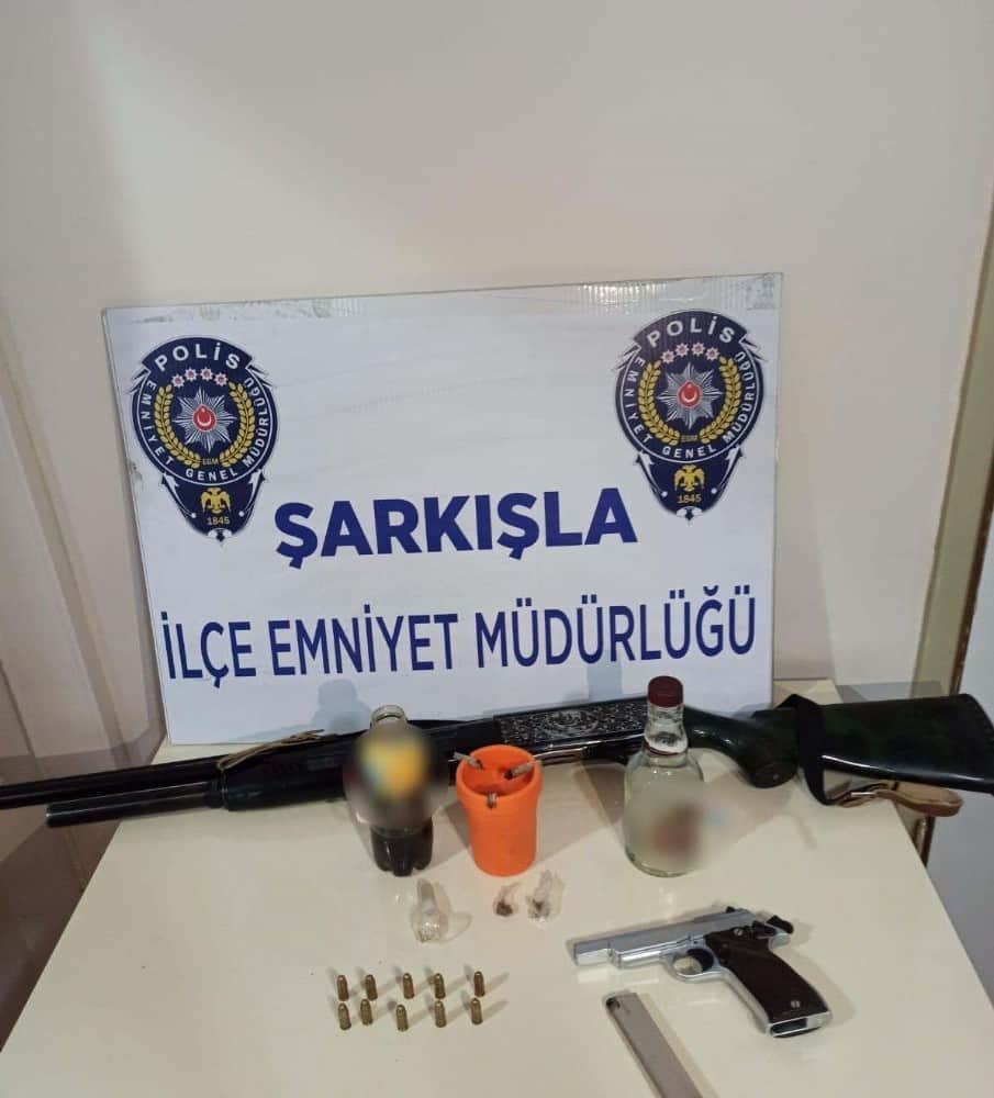 Şarkışla ilçesinde de sürdürülen operasyonlarda benzer şekilde uyuşturucu satıcısı 1 kişi yakayı ele verdi. Yapılan denetimlerde yakalanan bir kişinin üzerinde ruhsatsuz av tüfeği, 10 adet mermi, ruhsatsız tabanca ve 0,73 gram esrar ele geçirildi. Yakalanan şahısla ilgili yasal işlem gerçekleştirildi.