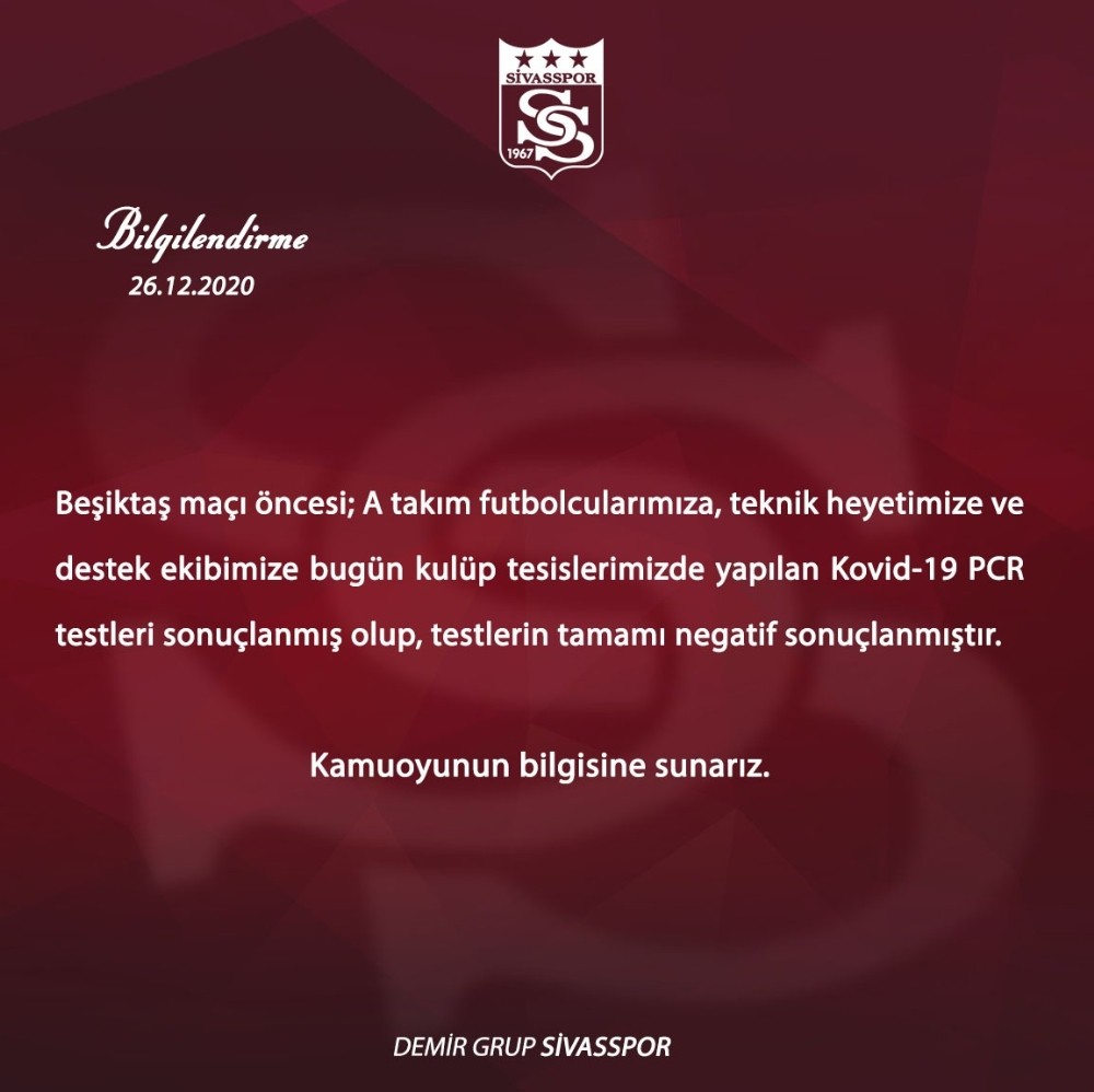 DG Sivasspor tarafından yapılan resmi açıklamaya göre oyunculara ve teknik heyete yapılan tüm korona virüs testlerinin negatif çıktığı bildirildi.