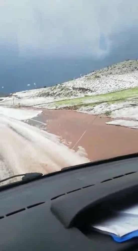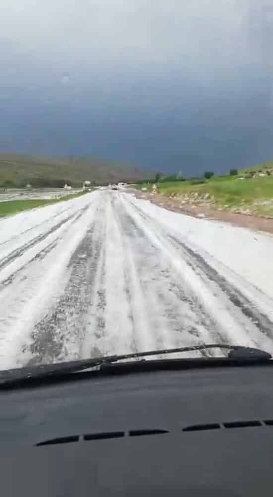 Haziran ayına girilmesine rağmen bir süredir yeniden soğuk havaların etkisine giren Sivas’ta kısa bir süre önce yaşanan olumsuzlukların yaraları kapatılmaya çalışılırken, bugün Çeltek köyünde dolu yağışı sebebiyle yolların beyaza bürünmesi dikkat çekti. Hem köy yolunu, hem de buğday tarlalarını beyaza bürüyen dolu yağışı, o an bölgeden arabasıyla geçen bir vatandaş tarafından cep telefonu kamerasıyla kayda alındı.