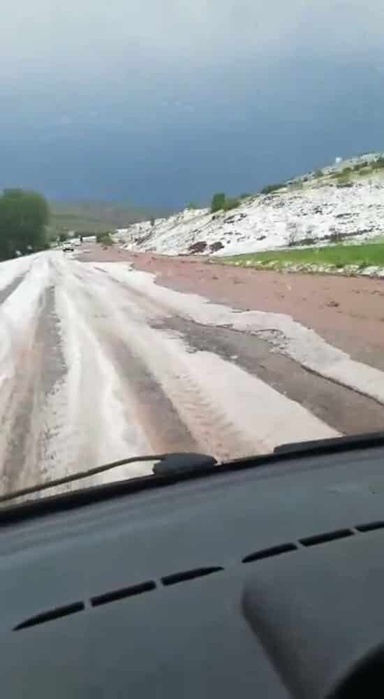 Sivas’ın merkezine bağlı olan Çeltek köyünde dolu yağışının etkili olması sebebiyle arazi ve yollar bembeyaz hale geldi.